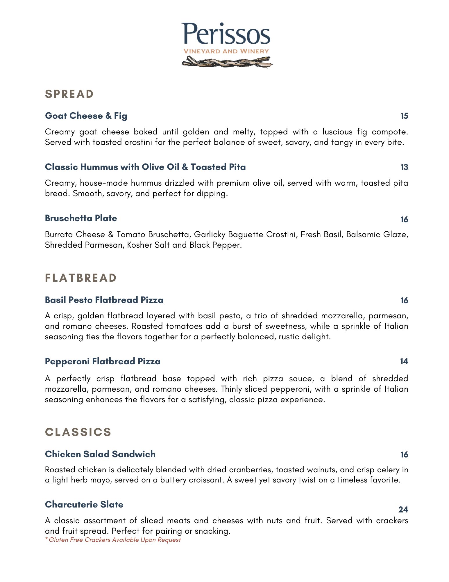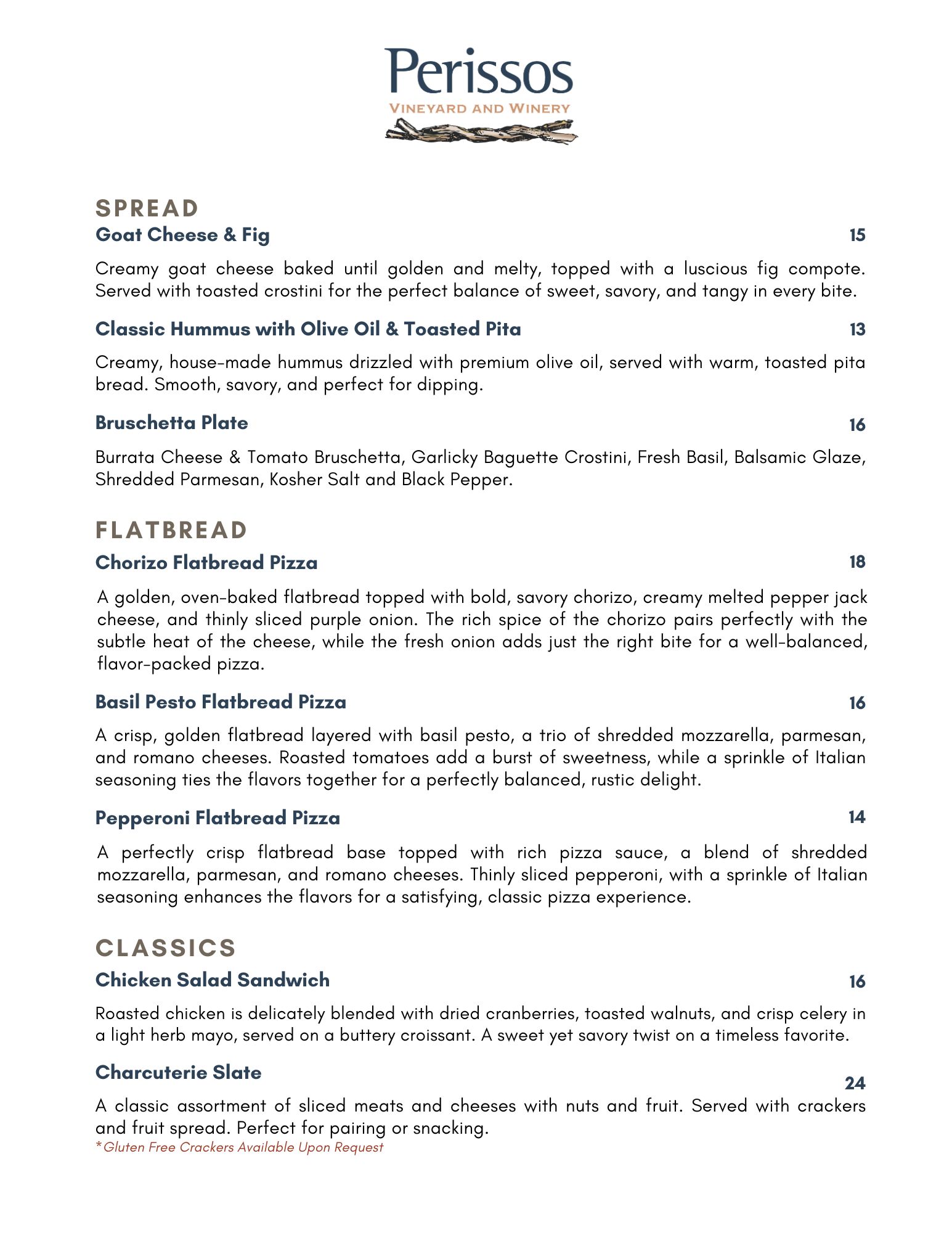 At Perissos Vineyard and Winery, we believe that great wine deserves great food. Our menu is carefully curated to complement our award-winning wines, offering a selection of dishes that are as delightful as our vintages. Each plate is crafted with the finest ingredients, ensuring a dining experience that is both memorable and satisfying.