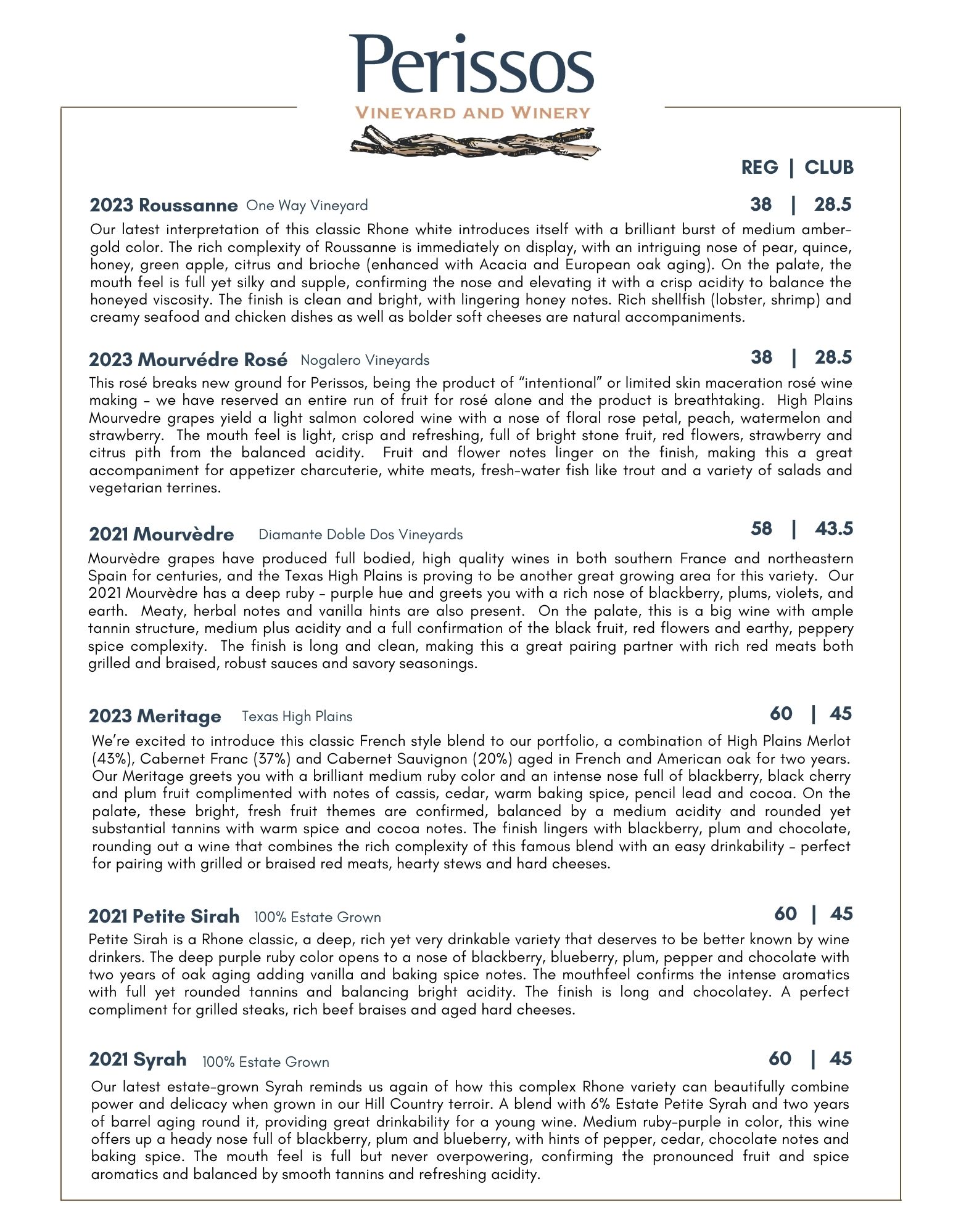 Each month features a thoughtfully curated wine tasting experience, highlighting seasonal selections designed to showcase the character and craftsmanship of our wines. Crafted from 100% Texas-grown grapes, each pour reflects our commitment to quality and tradition, offering a true expression of Perissos in every glass.